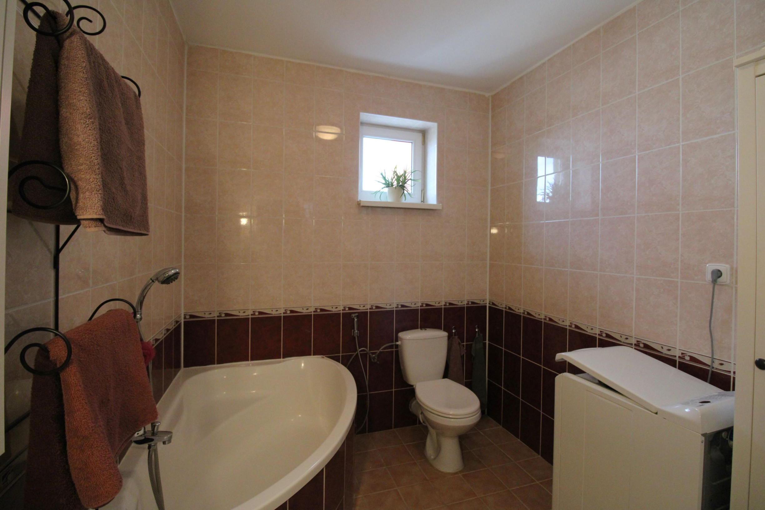 kúpeľňa s oknom a WC, vybavená skrinkou, vaňou, umývadlom, práčkou