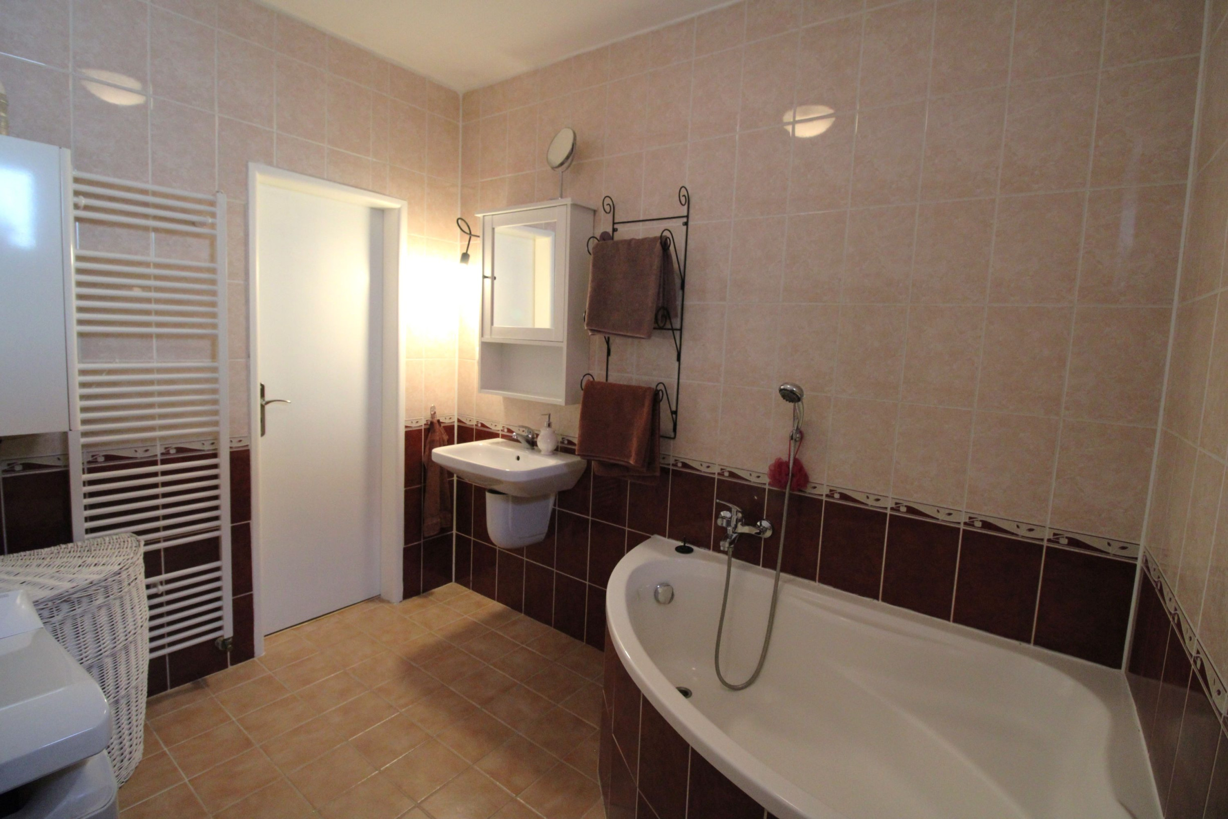 kúpeľňa s oknom a WC, vybavená skrinkou, vaňou, umývadlom, práčkou