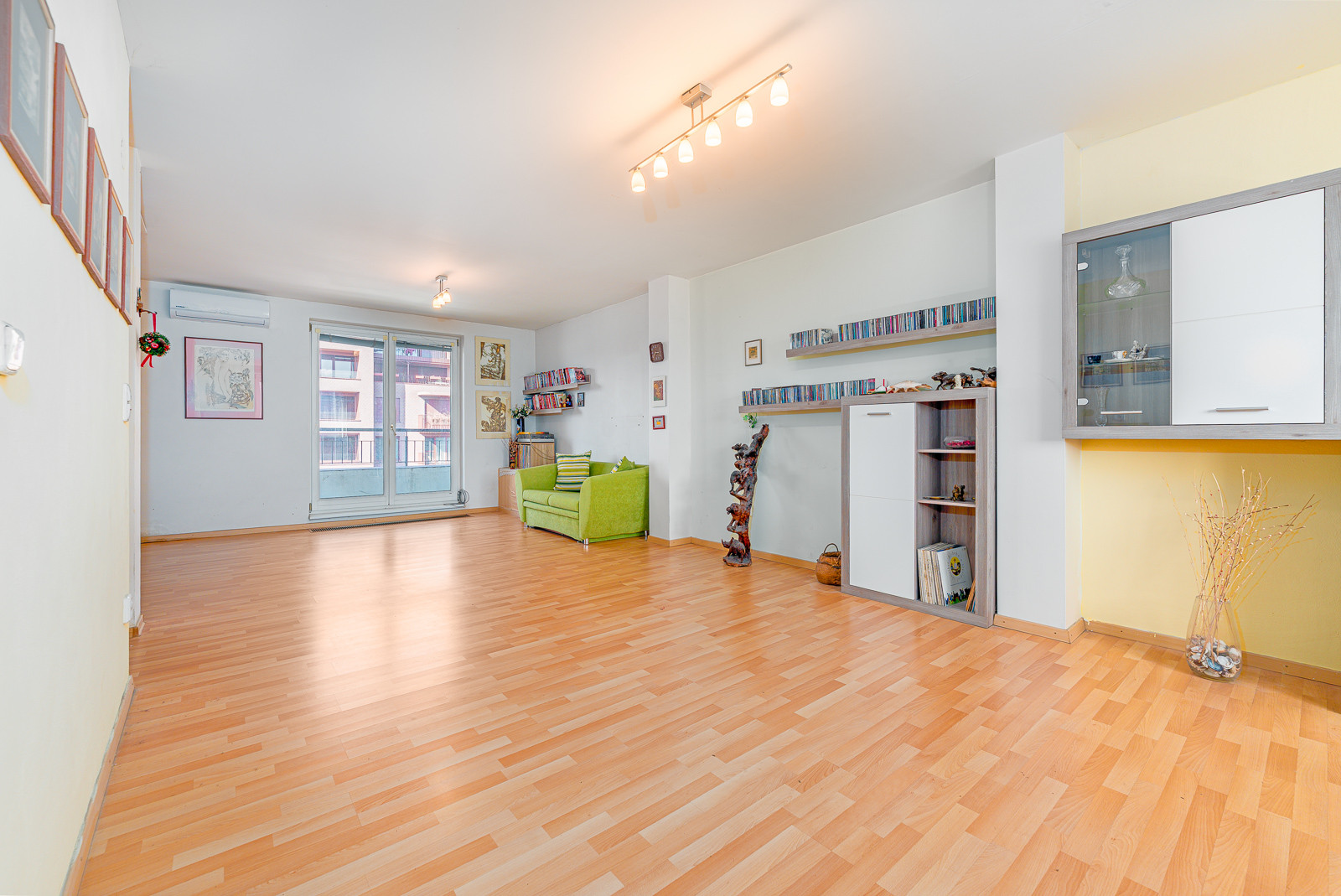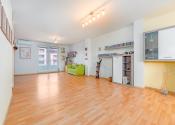 * veľkorysý otvorený obývací priestor s kuchyňou na prízemí bytu s útulnou loggiou